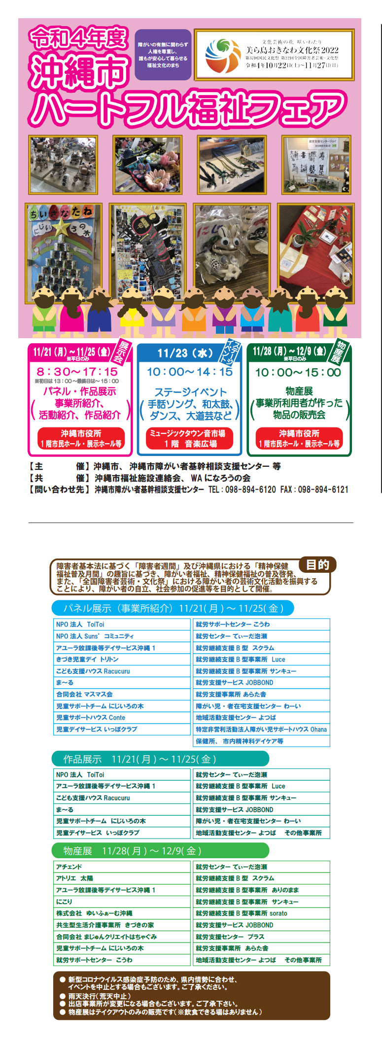 沖縄市内の障がい福祉サービス事業所や精神デイケアを対象に呼びかけ、活動のパネル展示や作品展示及び販売会、ステージイベントなどを実施します。